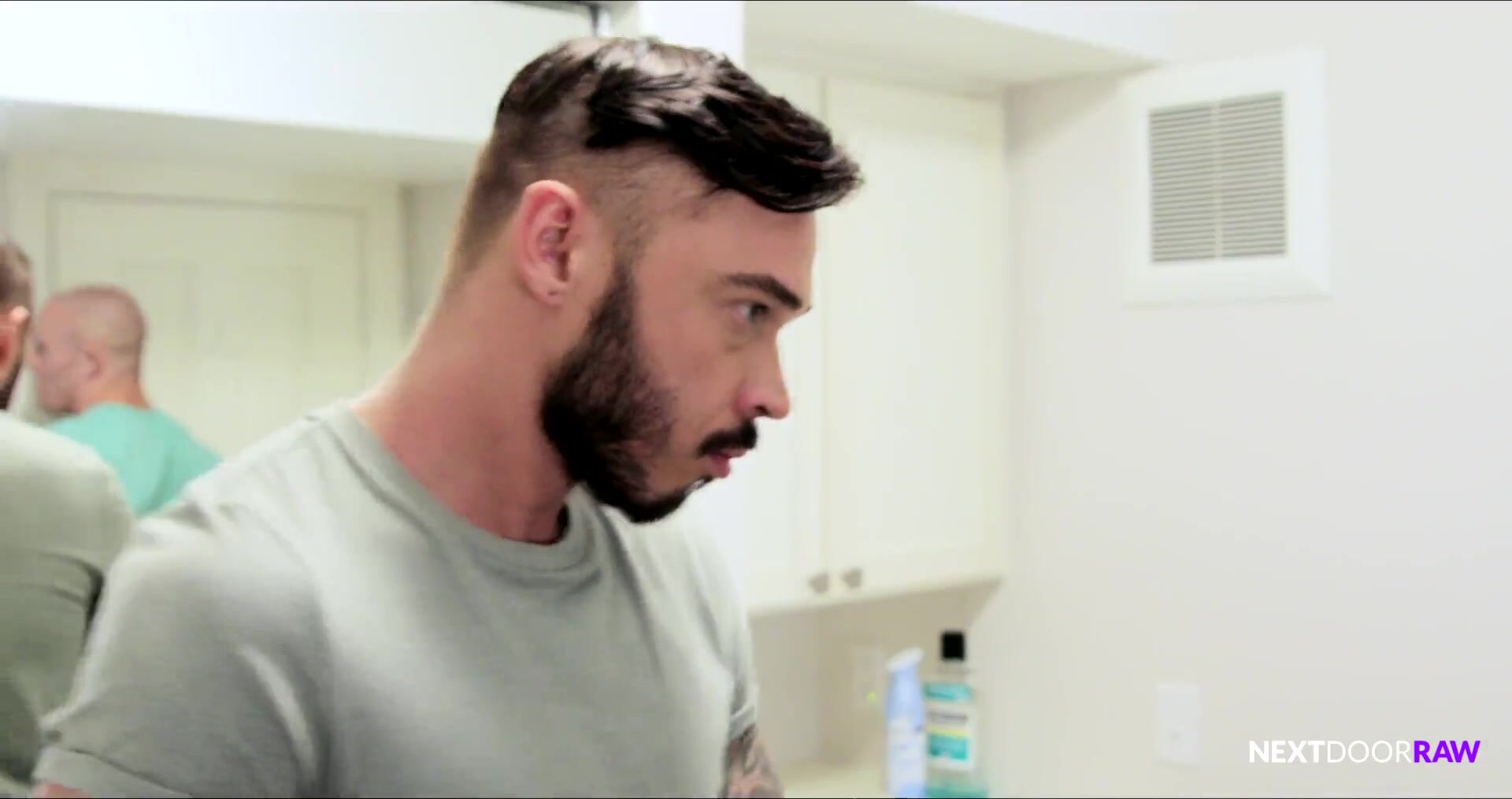 With all the bros already over, the after-game party is in full swing by the time Trevor Laster arrives. His buddies are all happy to see him, but one bro, Chris Knight, is particularly glad to see him. The party proceeds out to the pool while Chris makes his way to the lavatory. Trevor follows him there and they are finally united in privacy, but Chris tells Trevor he's nervous they'll get caught. Trevor isn't trying to hear Chris' excuses, telling him they can find a place on the grounds. They settle on a little used back porch as Trevor and Chris sneak in a private fuck. Chris takes the raw cock as Trevor serves it up hot and hard, fucking Chris' hole every way he desires before blasting his bro with his seed. Chris, already covered in his own nut, watches as Trevor coats him, and as they laugh and kiss, they hear voices coming, so they quickly disappear to re-emerge and blend in with the party, their secret still intact - Trevor Laster, Chris Knight